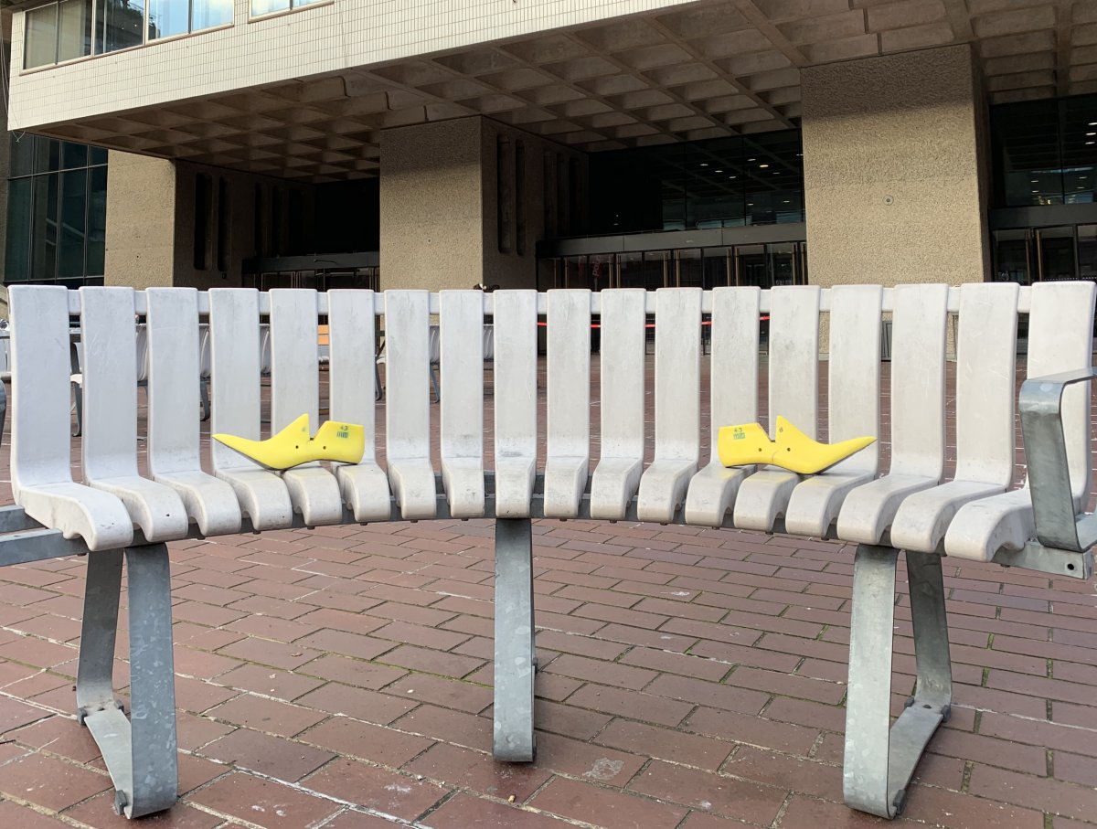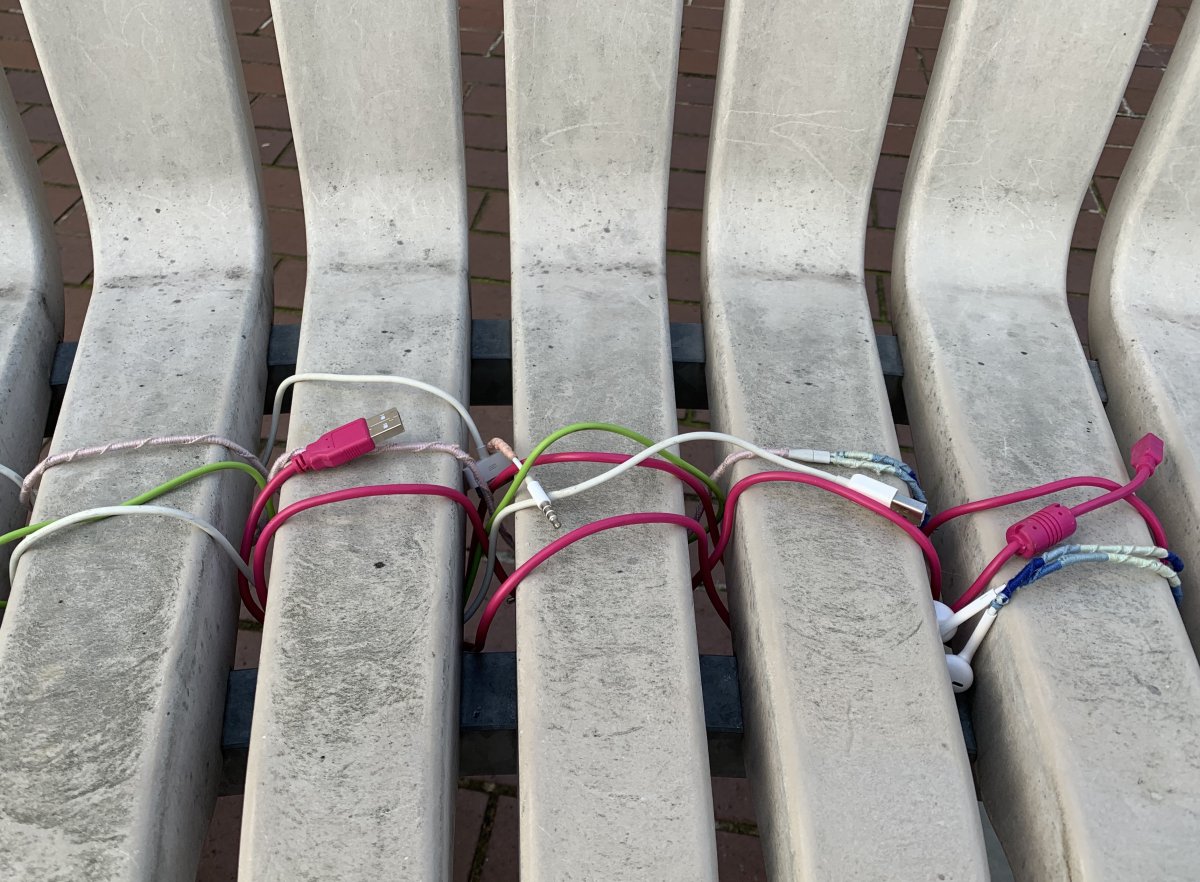 Weaving the fluid, malleable cables on the rigid, concrete bench created this clear contrast in my mind: PERSONAL/NON PERSONAL. Things such as headphones are something lifeless, a very basic object, but used constantly in everyday life, an object that connects us to sounds such as music, or the voice of someone dear, and at the end of the day, they are a more personal object than a lot of other very obvious ones. Also, this connection gives some sort of a feeling of belonging to something: to a state of mind, to a group of people, to a family or to something even bigger.