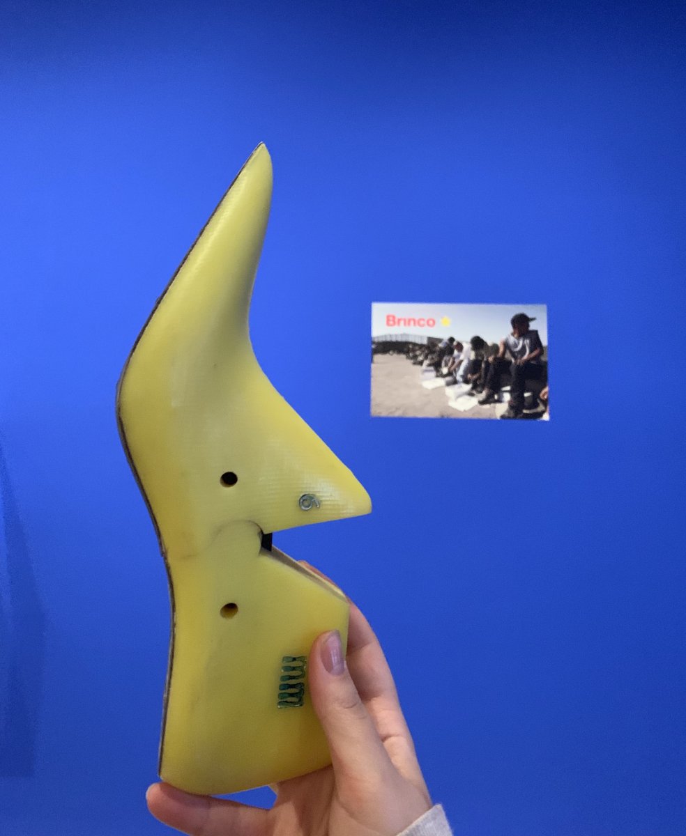 The shoe last next to BRINCO Room (@Tate), the shie prototype made for Mexican refugees. The strong blue background made me realise how well the blue IKEA bags would work with the citron yellow of the lasts.